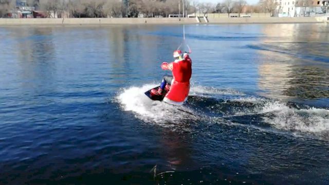 В Астрахани, переживающей необычно теплую зиму, местный житель прокатился по городскому каналу в центре на вейкборде в костюме Деда Мороза.