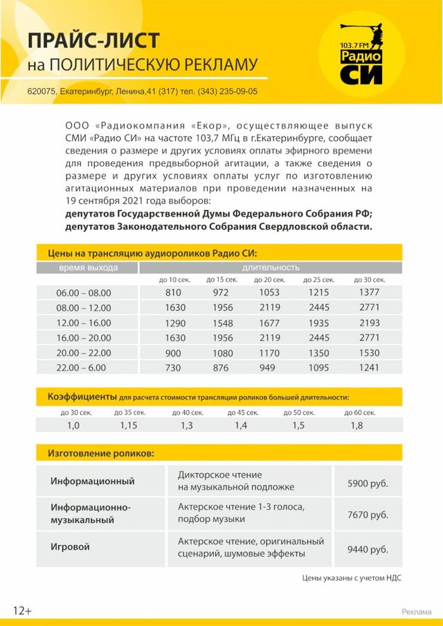 Прайс-лист на политическую рекламу радио «Радио СИ»