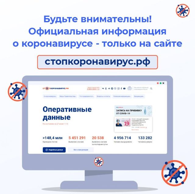 В интернете появились мошеннические сайты, дублирующие официальный портал. Их авторы повторяют символику официального сайта, но называются иначе: «coronavirus-stop», «stopcoronavirus-rf». Опубликованная на сайтах-двойниках информация не является проверенной.