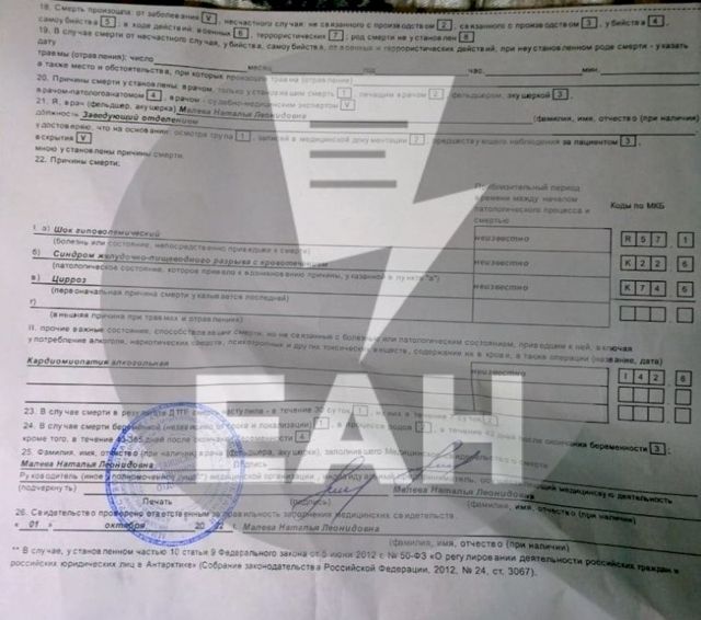 В медицинском свидетельстве о смерти, которое предоставил ЕАН брат умершего Андрей Козлов, сказано, что причиной смерти стал цирроз на фоне алкогольной кардиомиопатии. Желудочное кровотечение, начавшееся у Дениса перед смертью, было вызвано терминальной стадией заболевания, когда сосуды не выдерживают нагрузки. Андрей не знал о циррозе у брата, тот никогда не жаловался, правда, кожу имел зеленоватого оттенка. Раньше выпивал, но в последнее время уже давно не пил.
