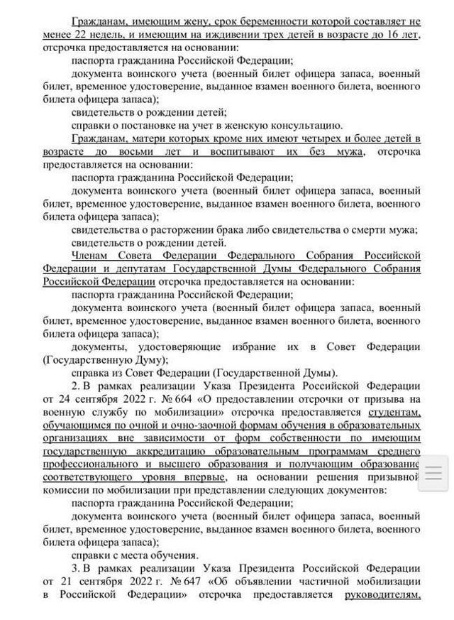 Генеральный штаб Российской Федерации разослал во все военкоматы страны памятку, в которой перечислил ситуации, при которых граждане могут получить отсрочку от мобилизации. ЕАН писал, что соответствующее поручение дал глава Минобороны России Сергей Шойгу.