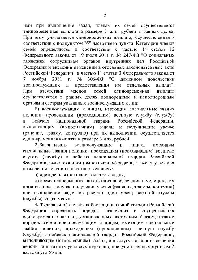 Согласно указу, выплаты распространяются на семьи сотрудников полиции, Росгвардии, а также военнослужащих. В случае гибели участника СВО полагается выплата его родственникам в размере 5 млн рублей. За получение ранения или травмы предусмотрена компенсация на сумму 3 млн рублей.