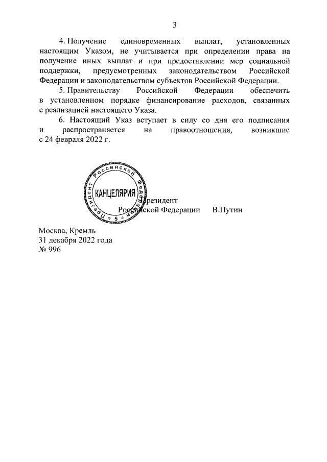 Президент РФ Владимир Путин подписал указ о дополнительных выплатах семьям военнослужащих и силовиков, участвующих в специальной военной операции. Документом предусмотрены выплаты в случае гибели или ранения участника СВО.