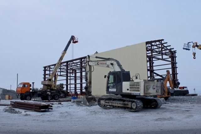 Сейчас строители заканчивают обшивку навеса профлистом. Навес размером 36х12 м необходим для исключения попадания влаги при взвешивании машин.