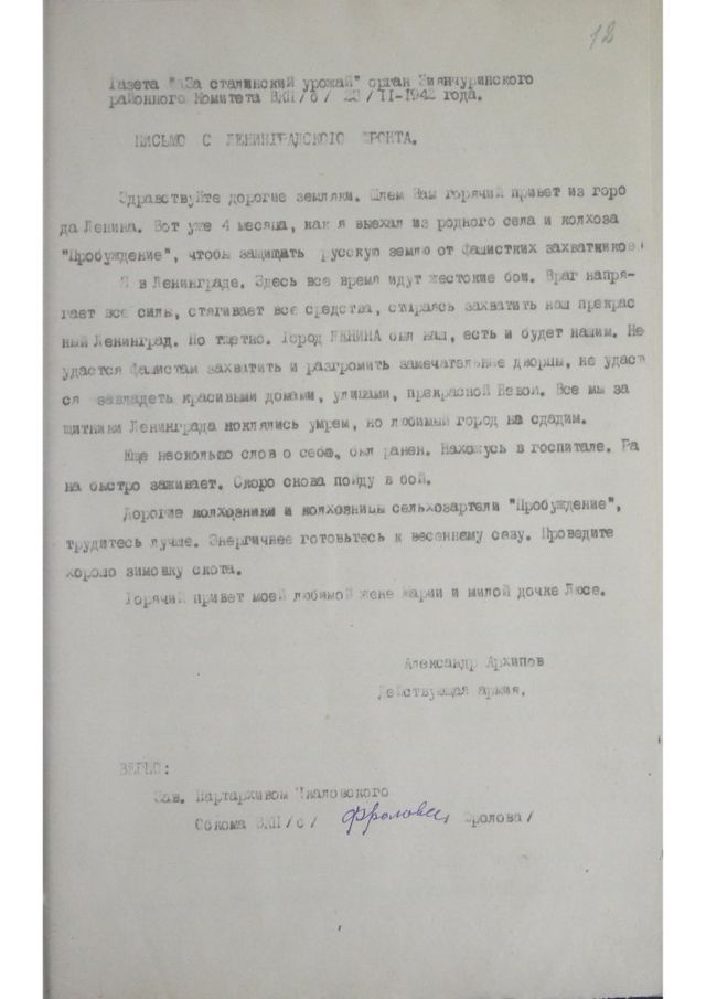 Оренбургские архивисты нашли письма родственникам от Александра Архипова и Зайнуша Мусалимова. Они были опубликованы 28 ноября 1942 года в газете «За сталинский урожай» Зиянчуринского района (сейчас это Кувандыкский район).
