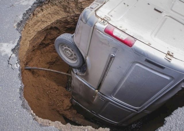 Провал составляет около 3 м в диаметре. Глубина ямы – более 5 м, и пятиметровый микроавтобус погрузился в провал полностью.