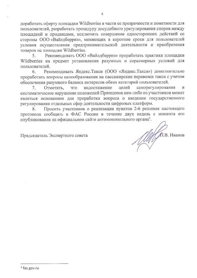 Как следует из отчета заседания (есть в распоряжении ЕАН), экспертный совет разбирал жалобы на «Авито», ЦИАН, «Яндекс.Такси» и Wildberries. Последняя компания в последнее время была в эпицентре скандалов из-за многочисленных жалоб партнеров маркетплейса. В целом, как следует из документа, в совете ограничились рекомендациями по исправлению работы тех или иных компаний. Например, «Яндекс.Такси» посоветовали дополнительно проработать вопросы ценообразования на пассажирские перевозки. Это связано с многочисленными жалобами водителей на несправедливые расценки агрегатора. По Wildberries экспертный совет составил серию рекомендаций. В частности, сделать прозрачным механизм оферты (партнеры компании жаловались, что маркетплейс использует оферту, чтобы загнать предпринимателей в кабальные условия работы).