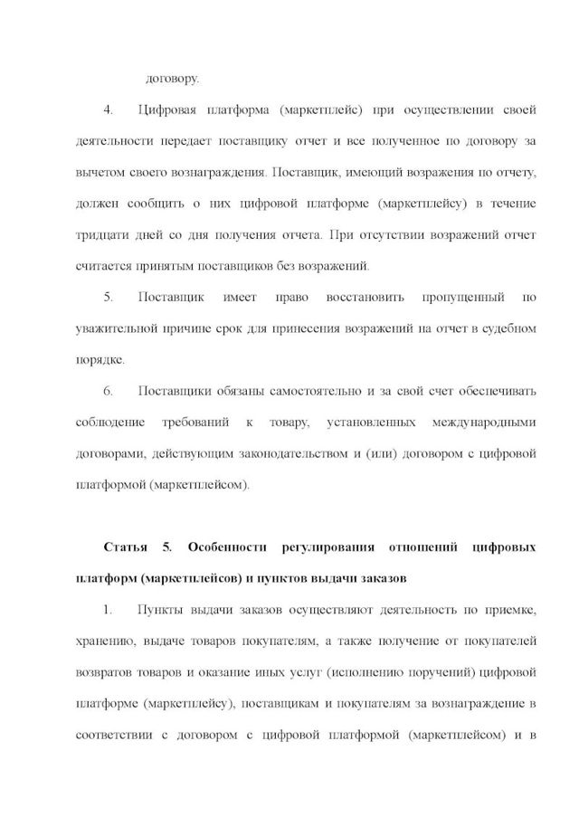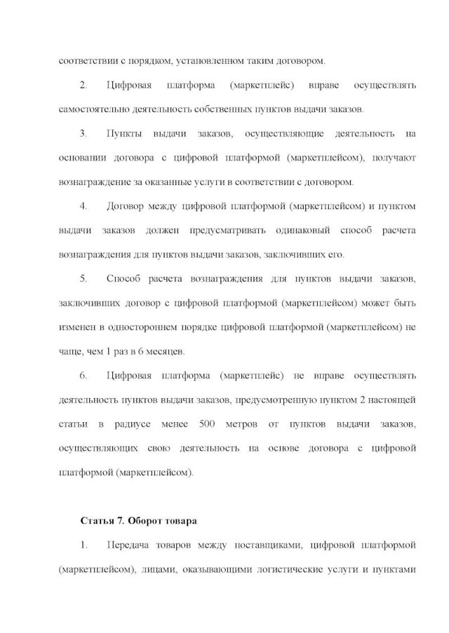 В самом законопроекте прописаны взаимоотношения между маркетплейсами и партнерами. Если коротко, то в документе даны определения для участников отрасли: что считать маркетплейсами, пунктами выдачи заказов, поставщиками и т. п. Далее авторы законопроекта (судя по тексту) пытаются закрыть маркетплейсам лазейки, которые компании используют для одностороннего изменения правил в свою пользу.