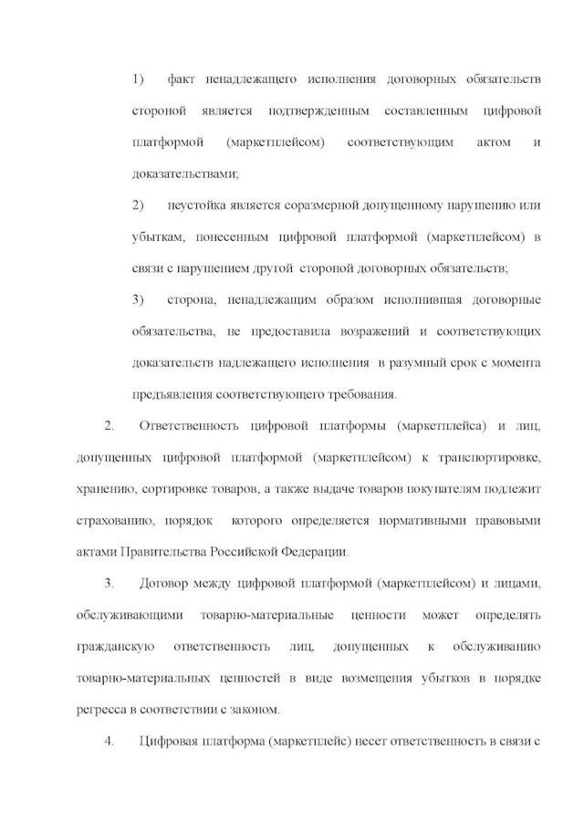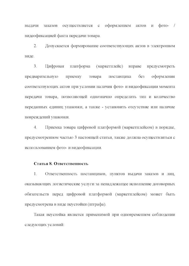 «Цифровая платформа (маркетплейс) вправе в одностороннем порядке вносить изменения в оферту, исходя из принципа разумности, добросовестности и обоснованности внесения таких изменений, при условии заблаговременного уведомления об условиях, ухудшающих положение второй стороны, принявшей условия оферты, о вносимых в нее изменениях не менее чем за 14 календарных дней до даты вступления в силу таких изменений», — говорится в документе.
