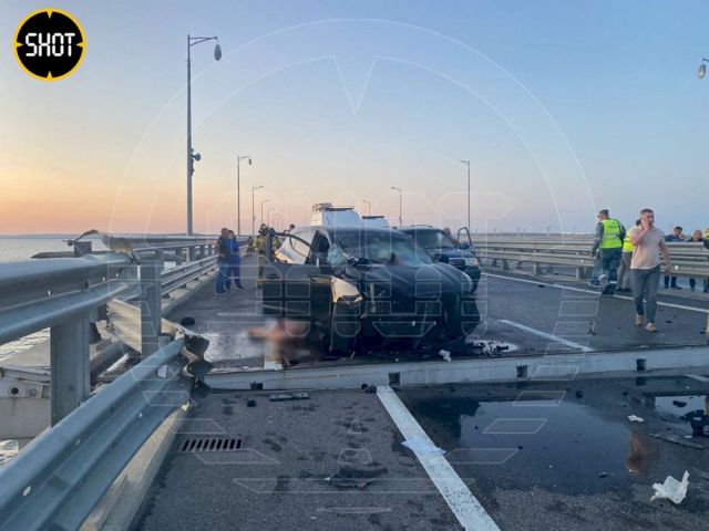 По официальным данным, мост был атакован двумя украинскими надводными беспилотными аппаратами. На записи сначала слышны выстрелы, возможно, охрана моста пыталась подбить беспилотники. А через несколько секунд прогремели взрывы. Поврежденный пролет Крымского моста просел на 50 см (в направлении Керчи). Другой пролет (в сторону Тамани) разрушен.