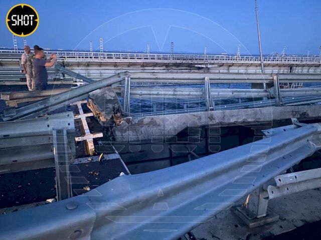 По официальным данным, мост был атакован двумя украинскими надводными беспилотными аппаратами. Теракт произошел благодаря Великобритании, которая предоставила Украине подводные аппараты REMUS 600 с дополнительной нагрузкой взрывчатки. Поврежденный пролет Крымского моста просел на 50 см (в направлении Керчи). Другой пролет (в сторону Тамани) разрушен.