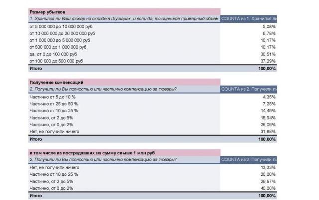 Согласно проведенному опросу, на отсутствие выплат пожаловались 31,9% продавцов, еще 26% получили на счет только 2% от стоимости товаров. До 5% получили 16% селлеров. Только 7,25% указали в анкетах, что получили более 50% от стоимости утраченных товаров.