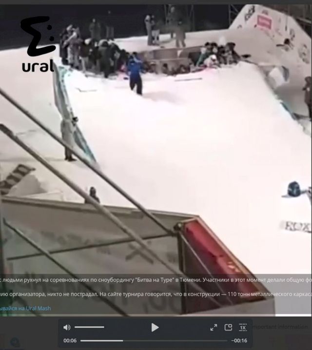 На соревнованиях по сноубордингу "Битва на Туре", проходивших в Тюмени, произошло ЧП: обрушился трамплин. На нем в тот момент находились люди, которые позировали для общей фотографии. Об этом сообщает telegram-канал Ural Mash.