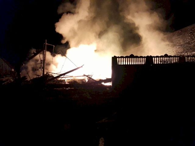 По предварительной информации, в результате нескольких сбросов взрывных устройств полностью сгорели частный дом и сарай, еще один жилой дом сильно поврежден. В данный момент оперативные службы находятся на месте. Обход территории будет проводиться в светлое время суток.