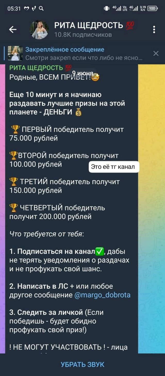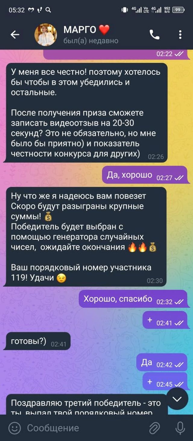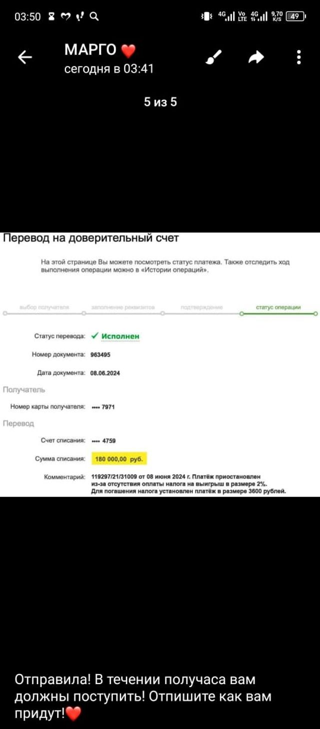 «Мне пришло сообщение с telegram-канала «Марго», что у них был розыгрыш, случайно выпал мой телефонный номер и я выиграла 150 тыс. рублей. Со мной связалась менеджер канала и сообщила, что надо заплатить налог 3600 рублей. Я несколько раз отправляла деньги, но всякий раз что-то мешало им дойти до адресата. В общей сложности я отправила 13200 рублей. Мне даже пообещали, что в качестве компенсации мне заплатят 180 тыс., а не 150», - рассказала ЕАН Александра.