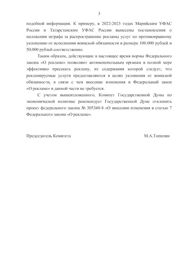 «Реклама не должна побуждать к совершению противоправных действий. Соответственно, в случае распространения рекламы услуг, из содержания которой четко следует, что рекламируемые услуги предоставляются в целях незаконного уклонения от воинской обязанности, такая реклама будет содержать признаки нарушения п. 1 ч. 4 ст. 5 федерального закона «О рекламе» и при выявлении таких случаев антимонопольные органы применят меры, предусмотренные законодательством Российской Федерации о рекламе. Таким образом, действующие в настоящее время нормы федерального закона «О рекламе» позволяют антимонопольным органам в полной мере эффективно пресекать рекламу, из содержания которой следует, что рекламируемые услуги предоставляются в целях уклонения от воинской обязанности, в связи с чем внесение изменения в федеральный закон «О рекламе» в данной части не требуется», - считает Максим Топилин.