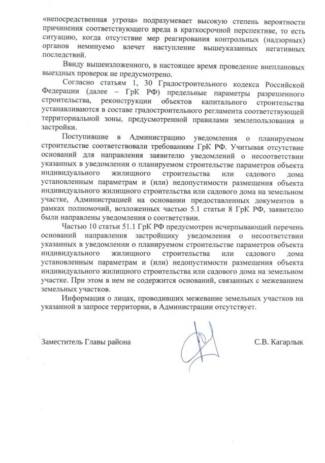 «Учитывая отсутствие оснований для направления заявителю уведомлений о несоответствии в указанных в уведомлении о планируемом строительстве параметров объекта индивидуального жилищного строительства и недопустимости размещения объекта индивидуального жилищного строительства на земельном участке, администрацией на основании предоставленных документов в рамках полномочий, возложенных ч. 5.1 ст. 8 ГрК РФ, заявителю были направлены уведомления о несоответствии», - сказано в ответе на запрос.