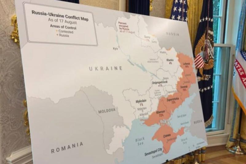 Перед переговорами в Овальном кабинете Белого дома была установлена карта Украины, на которой отмечены территории, контролируемые Россией, с обозначением в процентах. Согласно этой карте, в Днепропетровской, Николаевской и Сумской областях Украины Россия контролирует по 1% территории, в Харьковской - 4%, Запорожской и Херсонской областях - по 73%, в ДНР - 76%, в ЛНР - 99%, и, наконец, Крым на 100% является российским еще с 2014 года.