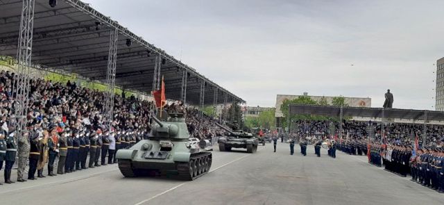 По площади Ленина прошла военная техника. Колонну возглавил легендарный танк Т-34, который передвигался своим ходом.