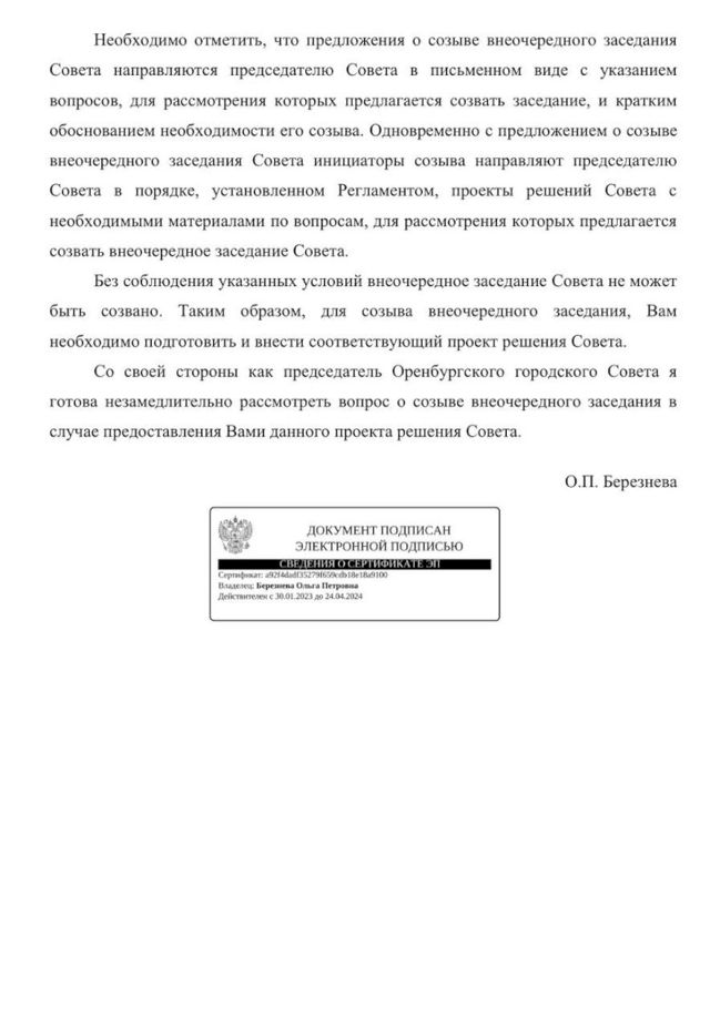 Кроме того, Сергею Николаеву указали на необходимость предварительно предоставить проект решения, которое должен будет рассмотреть депутатский корпус на таком заседании. Председатель горсовета Ольга Березнева, подписавшая документ, отметила в письме, что при наличии такого решения готова незамедлительно рассмотреть вопрос о внеочередном заседании.