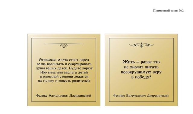 Таблички должны быть готовы к 1 июля. По эскизу, приложенному к конкурсной документации, они будут выполнены из латуни. Высказывания революционера нужно нанести черными буквами на золотистый фон. Отметим, что в примерных эскизах можно найти мысли Дзержинского о воспитании детей, добре, счастье, любви и долге перед Родиной.