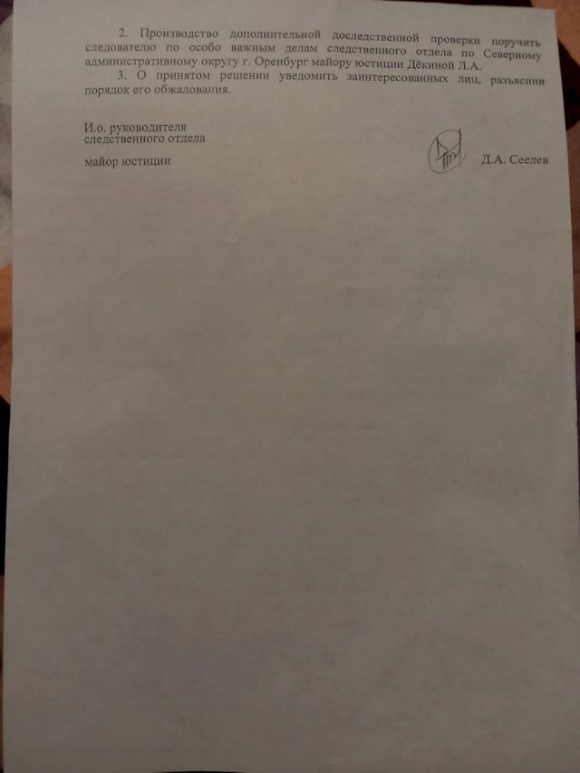 В июле 2023 года оренбургские следователи отменили постановление, по которому ранее было отказано в возбуждении уголовного дела. В десятидневный срок они должны были провести новую доследственную проверку и решить вопрос о возбуждении уголовного дела. Однако до сих пор никаких действий по этому вопросу не предпринято.