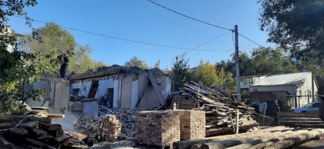В центре Оренбурга сносят двухэтажный дом на улице Малышевской, 28. Рабочие разбирают жилье вручную – видны засыпные стены, куча сложенных кирпичей и бревна.