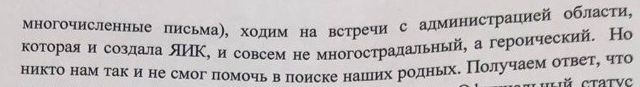 «Вот уже семь месяцев, сначала в одиночку, потом, найдя друг друга в пространстве интернета, жены, матери, сестры - сообща пишем обращения в Министерство обороны, военные прокуратуры разных уровней, в Следственные комитеты, в военную полицию, - следует из письма. - Пишем жалобы на абсолютно безмолвное бездействие части, молчание ее командиров (ни одного ответа на многочисленные письма), ходим на встречи с администрацией области, которая и создала «Яик», совсем не многострадальный, а героический. Но никто нам так и не смог помочь в поиске наших родных».