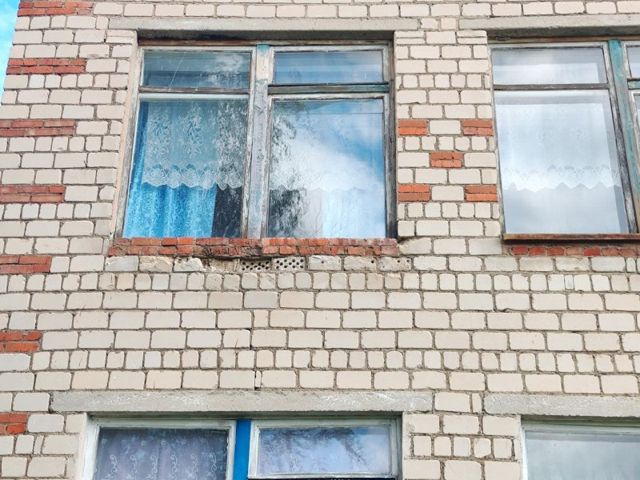 Более "побитой" выглядит здание СОШ № 4. На фасаде видны замазанные трещины, часть окон затянута в полиэтилен, часть кирпича на фасаде побилась. Однако в первую очередь приковывает взгляд старая печная труба, которая возвышается над зданием. Кирпичная кладка у ее основания начала разрушаться, заметна трещина у основания конструкции.