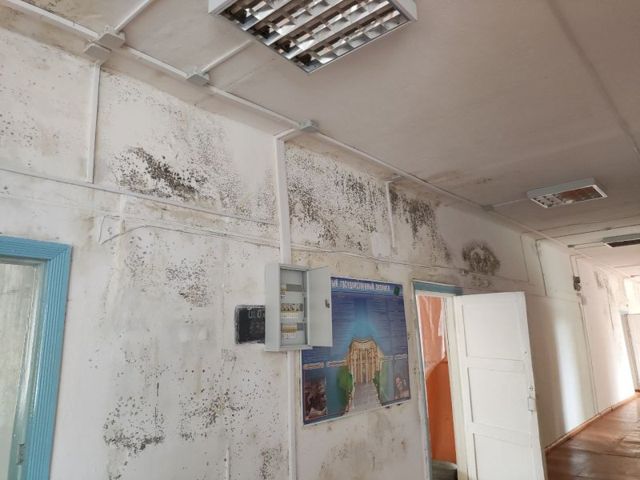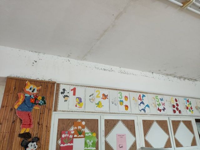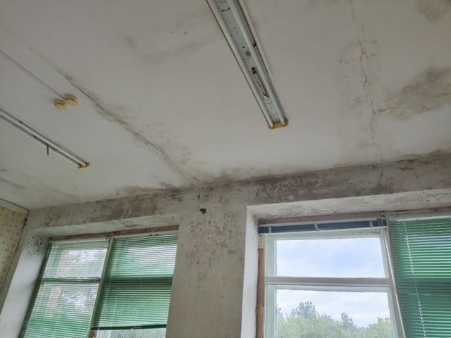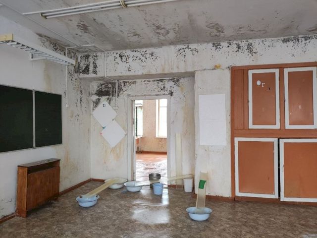 Дожди стали главной проблемой школы - за время работ подрядчик успел вскрыть крышу. Во время ливней вода без препятствий пошла на этажи и затопила здание. В школе вздулись полы и отсырели стены, частично испортилась мебель. Когда дожди прекратились, помещение "зацвело" - на стенах и потолке проступила плесень. На потоки воды, которые стекали к первому этажу, намекают стоящие в классах ведра и тазики. Теперь, прежде чем принять детей, помещение должно быть как минимум просушено, также там необходимо вывести грибок.