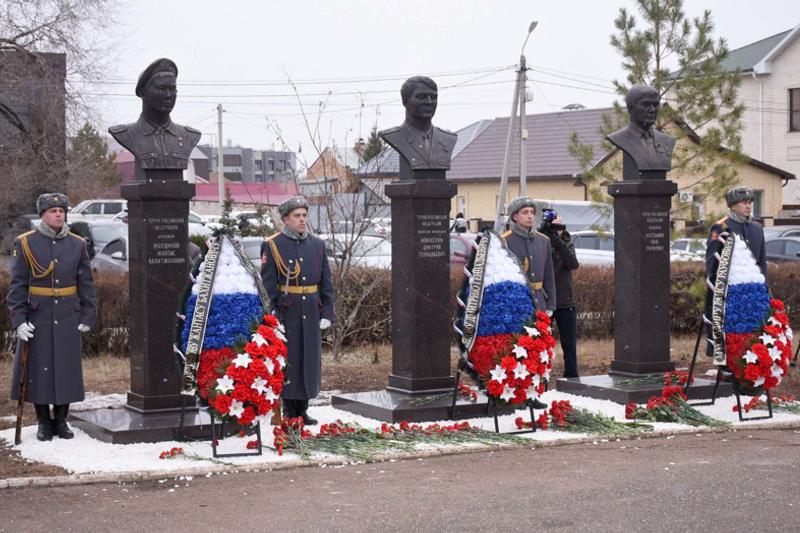 Бюсты трех Героев России установили в Оренбурге в сквере им. Самохина. На месте прошло торжественное открытие комплекса.