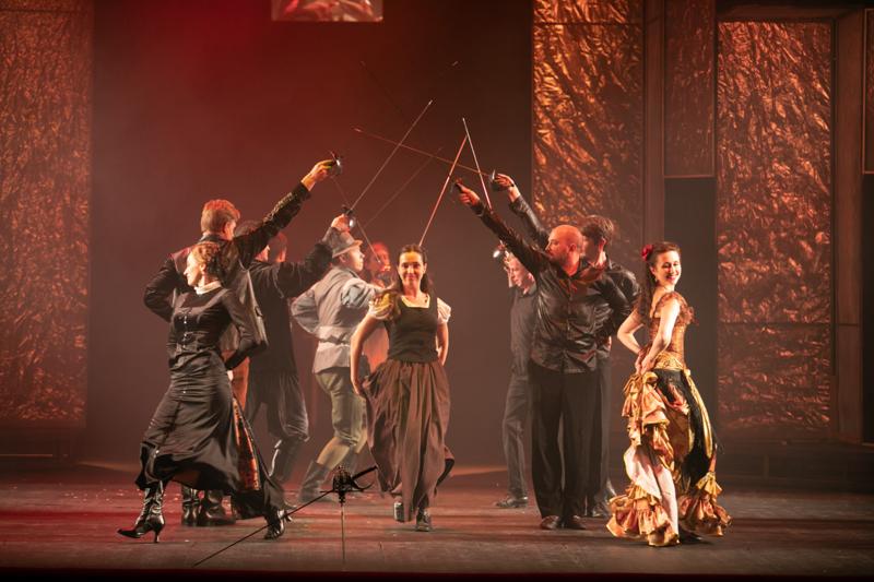 На сцене оренбургского театра кипели нешуточные испанские страсти – с боями на шпагах, которые поставил сам же Айдар Закиров. А соответствующее музыкальное оформление сразу перенесло зрителей в жаркую Испанию.