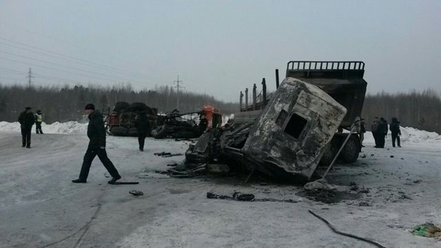 По предварительным данным, водитель МАЗа, двигаясь со стороны Нефтеюганска в сторону Пыть-Яха, по невыясненным причинам выехал на полосу встречного движения и врезался в бензовоз. Ехавшая за бензовозом иномарка также не смогла уйти от столкновения. От удара машины загорелись.
