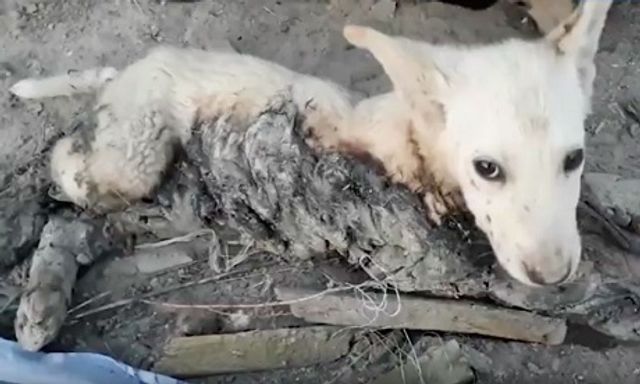 Волонтеры фонда помощи «Право на жизнь» достали собак. Их отвезли в вольер и пытались освободить от гудрона, прилипшего к шерсти. Гудрон слепил шерсть щенков под самую кожу.