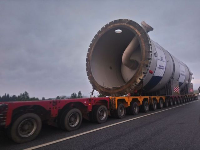 Напомним, из Екатеринбурга в Пермь по Московскому тракту начинают транспортировку второй партии двух гигантских адсорберов, сложных аппаратов для очистки газа. Они были изготовлены на заводе «Уралхиммаш» для КС «Славянская» (Кингисеппский район Ленинградской области). Высота цистерн составляет 19,1 м и диаметр – почти 6 м. Два автопоезда, на которых перевозят оборудование, состоят из специальных транспортеров, каждый из них обслуживают два тягача для «перехвата» грузовика при поворотах, а сопровождают машины прикрытия и трал с необходимым оборудованием.