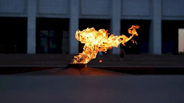 Он сорвал висящий на мемориале венок и бросил его в пламя. Венок сгорел, а звезда, из которой вырывается огонь, закоптилась.