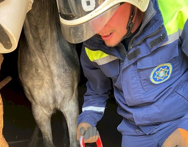 Прибыв к месту вызова, спасатели при помощи специального оборудования расширили металлическое отверстие кровати и освободили ногу лошади.
