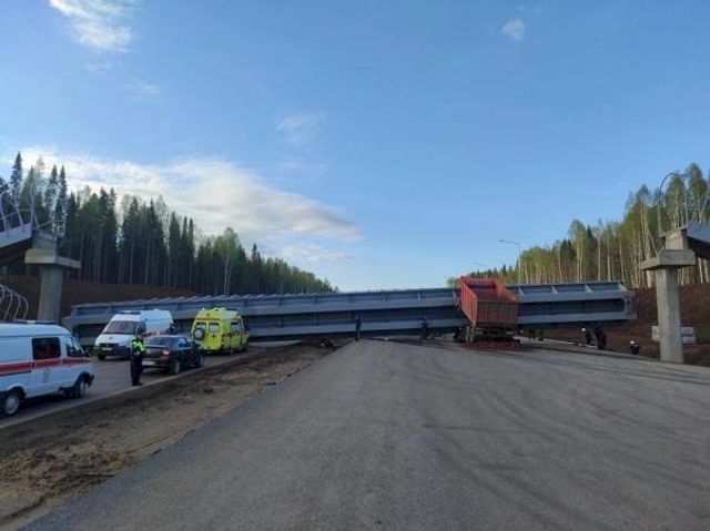 ЧП произошло на 55 км трассы Р-242 Пермь — Екатеринбург. Пешеходный мост обрушился прямо на кабину самосвала.