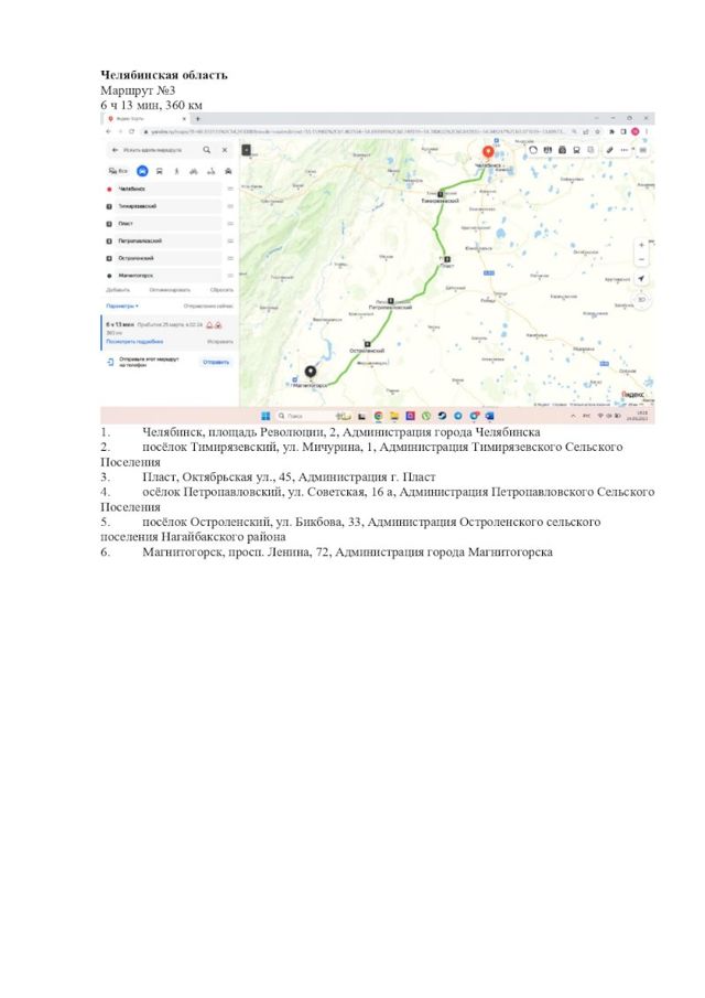 Третий маршрут – 360 км. Челябинск, Тимирязевский, Пласт, Петропавловский, Остроленский и Магнитогорск.