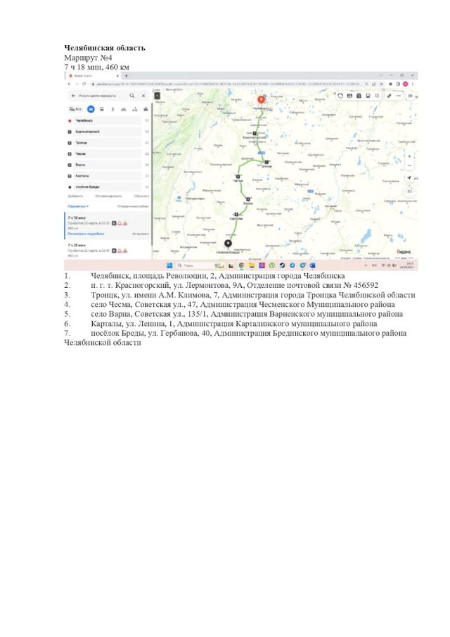 Четвертый маршрут – 460 км. Из Челябинска в пгт Красногорский, Троицк, Чесма, Варна, Карталы, Бреды.