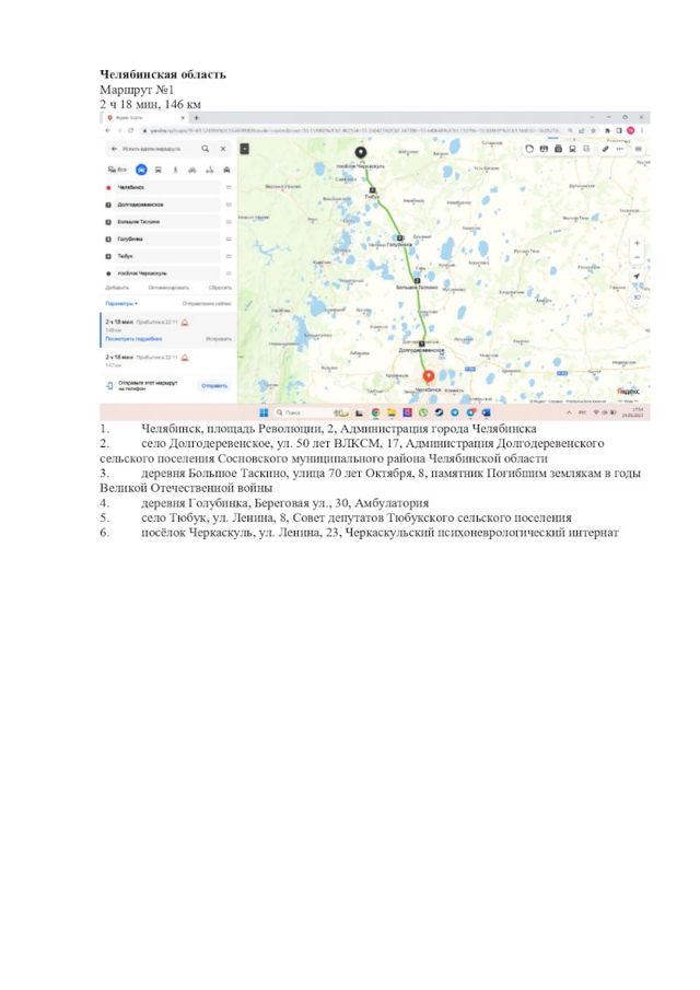 Первый маршрут – 146 км. Из Челябинска в Долгодеревенское, Большое Таскино, Голубинка, Тюбук и Черкасуль.