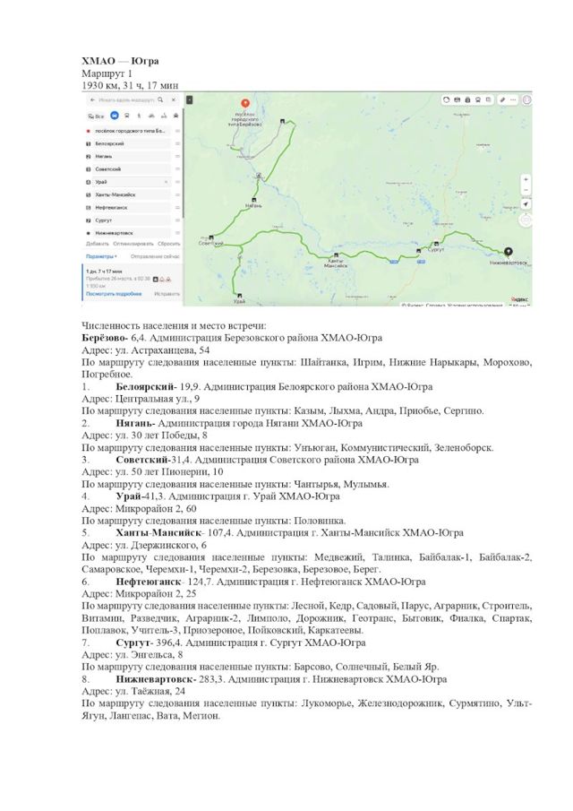 Там протяженность маршрута пробега составит 1930 км. Стартует автопробег из пгт Березово, путь пройдет через населенные пункты Шайтанка, Игрим, Нижние Нарыкары, Морохово и Погребное. Затем из Белоярского поедут через населенные пункты поселение Кызым, поселение Лыхма, пгт Андра, пгт Приобье и Сергино. Следующее направление из Нягани в Унъюган, пгт Коммунистический и пгт Зеленоборск. Далее из Советского в Чантырья и Мулымья. Из Урая поедут в п. Половинка.