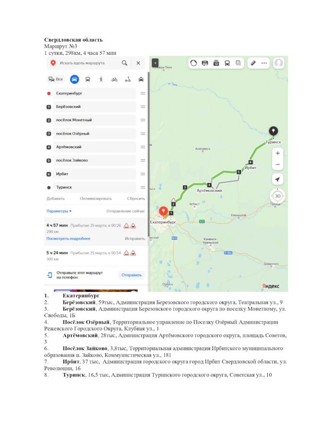 Третий маршрут составляет 298 км. Из Екатеринбурга поедут до Березовского, затем в Монетный, Озерный, Артемовский, Зайково, Ирбит и Туринск.