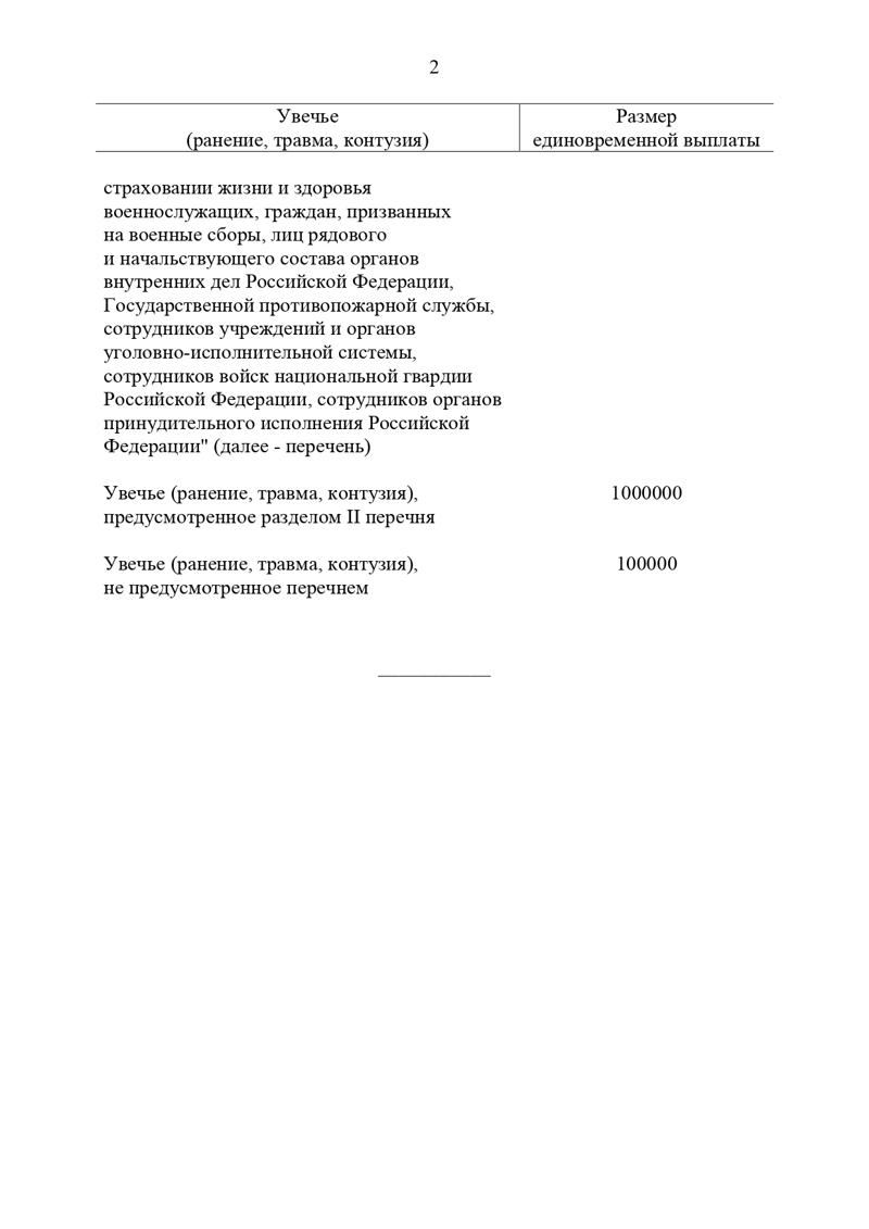 На основании указа председатель правительства РФ Михаил Мишустин подписал постановление об утверждении размеров выплат, дифференцированных в зависимости от тяжести ранения. Если раньше за любое ранение, независимо от степени тяжести, автоматически начислялось 3 млн рублей, то теперь выплаты будут иные. За тяжелое ранение по-прежнему будут выплачивать 3 млн рублей, за легкое ранение – 1 млн рублей, за иные травмы на службе – 100 тыс. рублей.