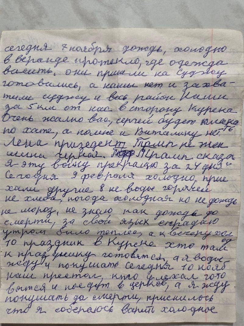 «В хате три градуса тепла, скоро конец. Вам желаю, чтобы были живы и здоровы. Я прожила много лет, хоть не хорошо. Окна все выбиты, шифер с сарая падает, и с хаты течь будет».