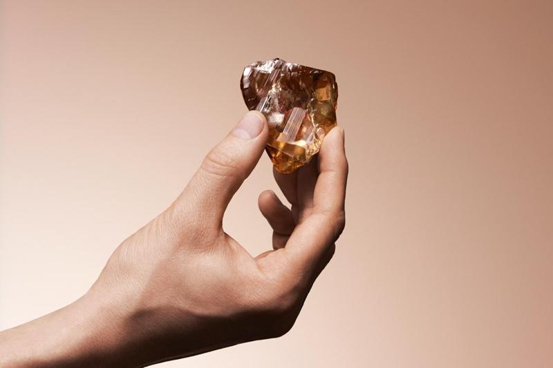 Минерал имеет благородный янтарный цвет, переливающийся золотистыми оттенками. А его грани заботливо отточила природа. Размеры алмаза 56-54-22 мм.