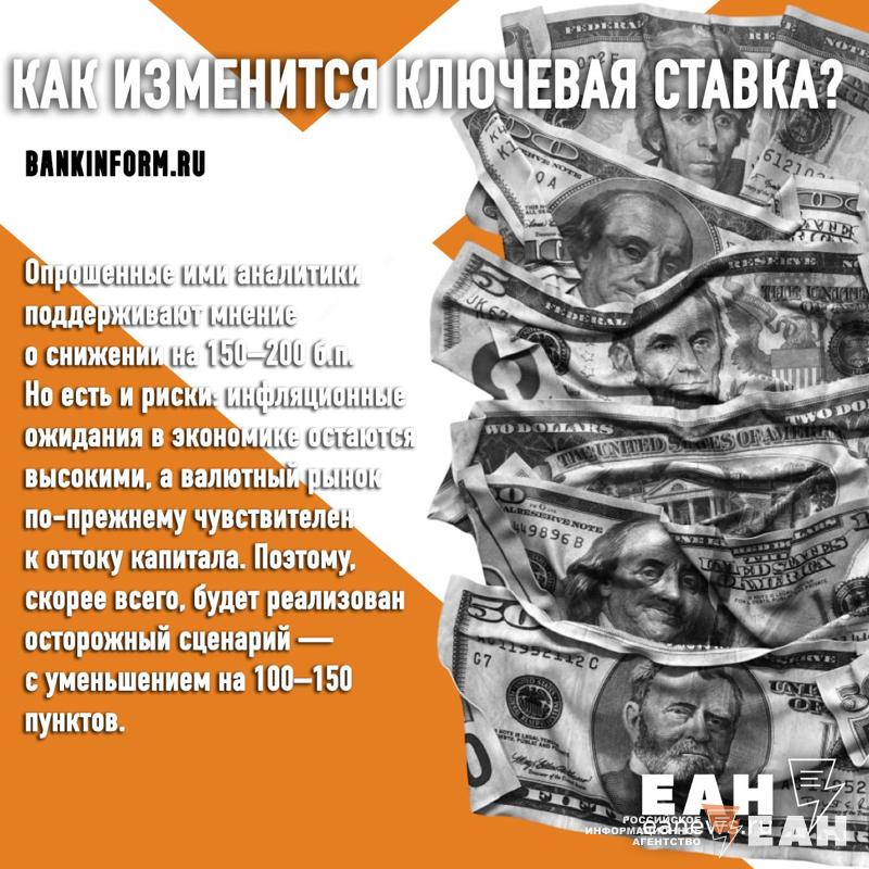 Опрошенные ими аналитики поддерживают мнение о снижении на 150–200 б.п. Но есть и риски: инфляционные ожидания в экономике остаются высокими, а валютный рынок по-прежнему чувствителен к оттоку капитала. Поэтому, скорее всего, будет реализован осторожный сценарий — с уменьшением на 100–150 пунктов.