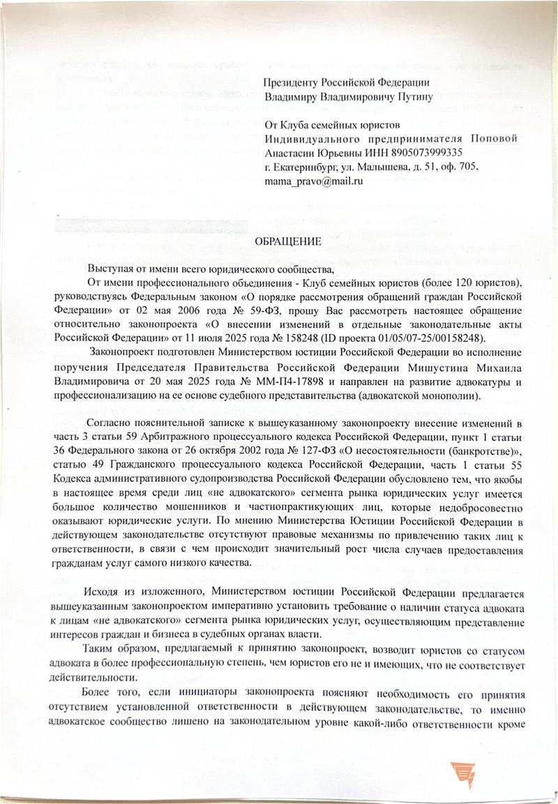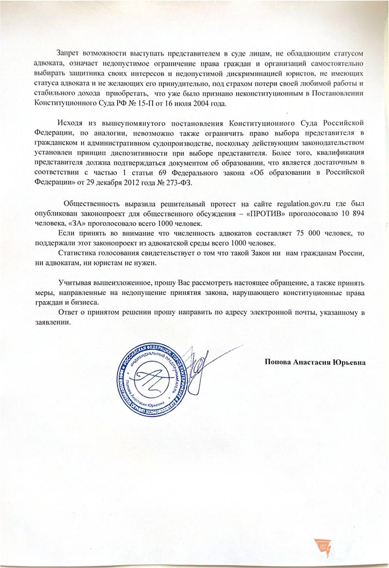 В обращении руководителя объединения Анастасии Поповой отмечается, что запрет на представительство в суде для юристов, которые не являются адвокатами, приведет к существенному подорожанию юридических услуг, сокращению налоговых поступлений от юристов и вызовет безработицу среди лиц, имеющих юридическое образование.