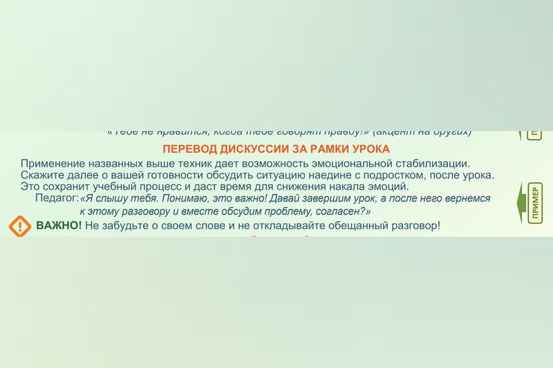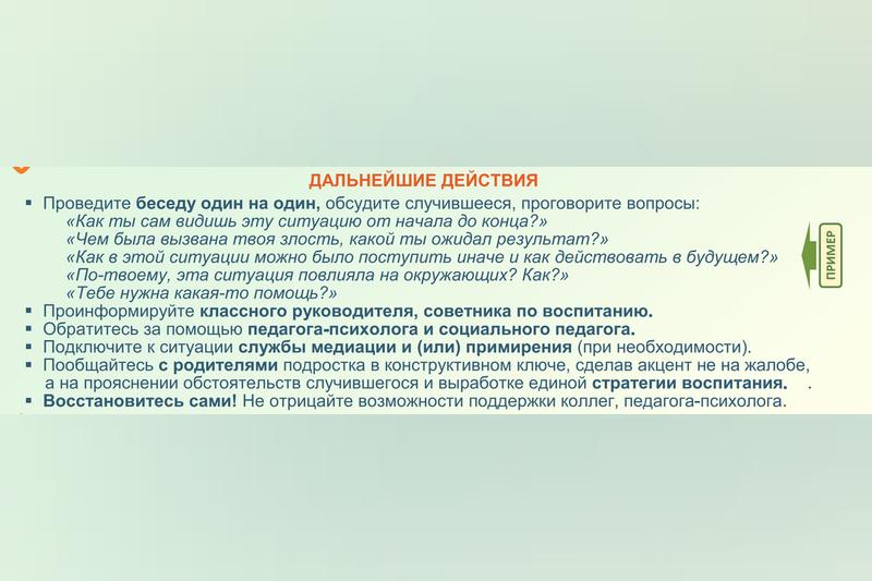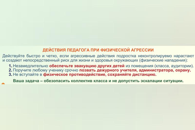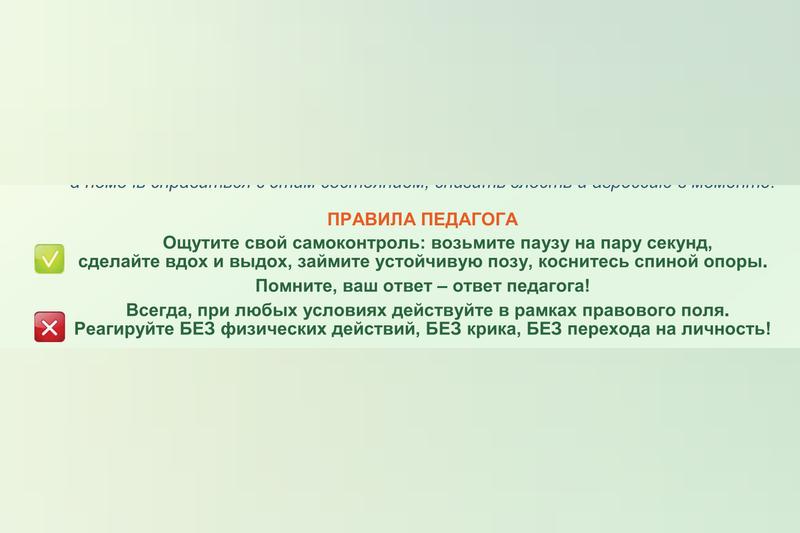 Действия учителя. Его послали на три буквы. Человек стоит где-то в 2-3 м от доски, что делать должен учитель? Читаем: «Ощутите самоконтроль, возьмите паузу на пару секунд, сделайте вдох и выдох, займите устойчивую позу, коснитесь спиной опоры!»