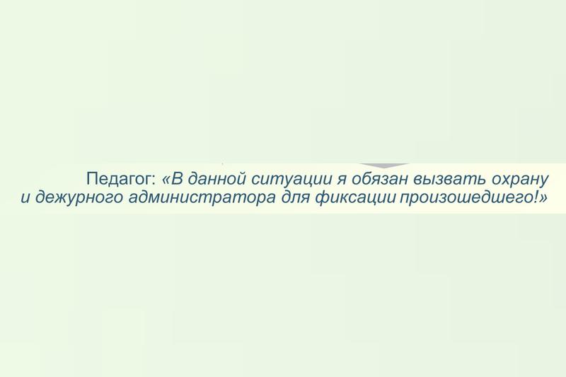 Как бы всё. На этом разбор можно завершить. Учитель попятился и молчит, чуть дыша. Вот что предлагает Минпрос. После этого он должен тихим голосом сказать кому-то, что сообщит охране, до которой нужно еще добежать, или некоему дежурному администратору. Это вообще кто такой? В школе нет такого человека!
